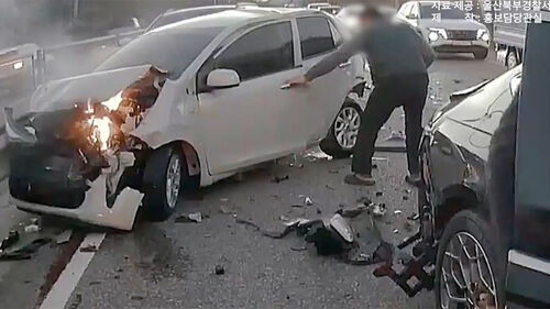 마침 인근에서 차를 타고 이동 중이던 울산경찰청 안보수사과 경찰관 5명이 '쾅'하는 소리를 듣고는 사고 현장 쪽을 바라보니 피해 승용차 1대에서 불이 나고 있었습니다.