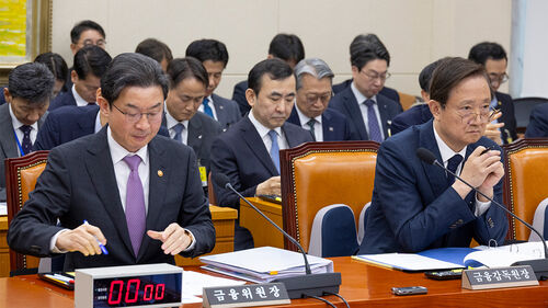 ▲ 이억원 금융위원회 위원장(왼쪽)과 이찬진 금융감독원장이 5일 국회에서 열린 정무위원회 전체 회의에 출석해 여야 의원들의 의사 진행 발언을 지켜보고 있다
