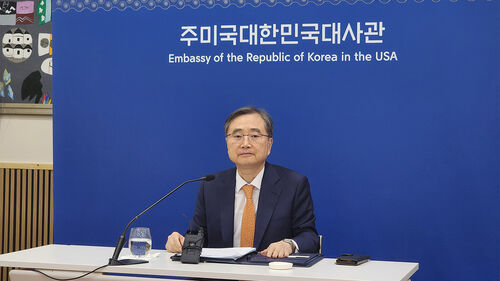 ▲ 조현 외교부 장관이 5일(현지시간) 미국 워싱턴DC의 주미대사관에서 한국 특파원단을 상대로 방미 결과를 설명하는 간담회를 진행하고 있다.