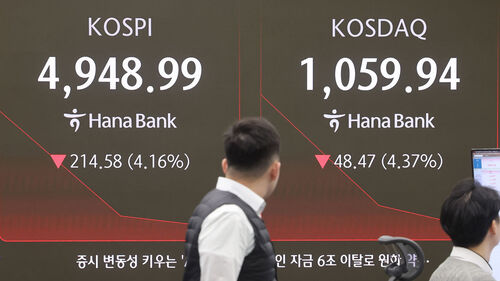 ▲ 코스피가 5,000선 아래로 떨어지며 출발한 6일 서울 중구 하나은행 딜링룸에서 직원이 업무를 보고 있다.