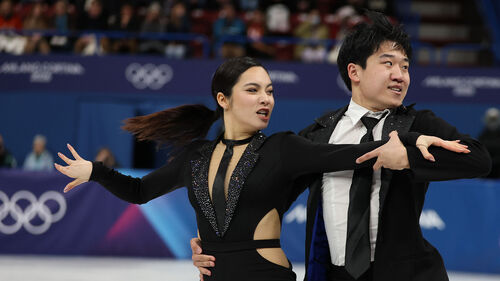 ▲ 2026 밀라노·코르티나담페초 동계올림픽 개막일인 6일(현지시간) 이탈리아 밀라노 아이스스케이팅 아레나에서 피겨 팀 이벤트 아이스댄스 임해나와 권예가 연기를 펼치고 있다.