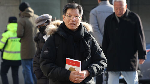 ▲ 일본군 '위안부' 피해자를 모욕하는 시위를 벌여온 혐의를 받는 김병헌 위안부법폐지국민행동 대표가 지난 3일 서울 서초경찰서에 피의자 신분으로 출석하고 있다.