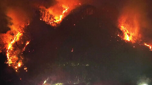 칠흑 같은 어둠 속, 산등성이를 따라 빨간 화염이 일렁이고 연기도 뿌옇게 피어납니다.
