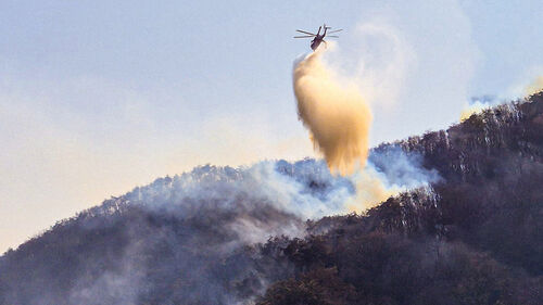소방헬기가 하늘에서 계속 물을 뿌려보지만, 불길이 쉽게 잡히지 않습니다.