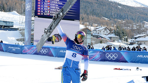 ▲ 8일(현지시간) 이탈리아 리비뇨 스노파크에서 열린 2026 밀라노-코르티나담페초 동계올림픽 스노보드 남자 평행 대회전 결승에 출전한 김상겸이 은메달을 확정 지은 뒤 기뻐하고 있다.