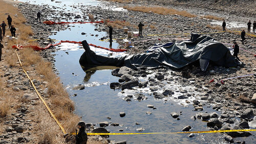 통제선 뒤로 찌그러진 헬기가 방수포에 덮여 있습니다.