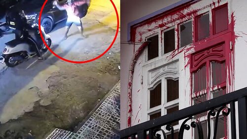 한밤중 한 무리의 젊은이들이 가정집을 향해 빨간색 페인트 병을 던집니다.