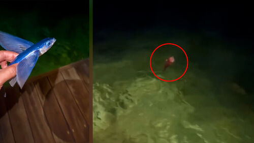 한 남성이 작은 물고기를 집어 올립니다.