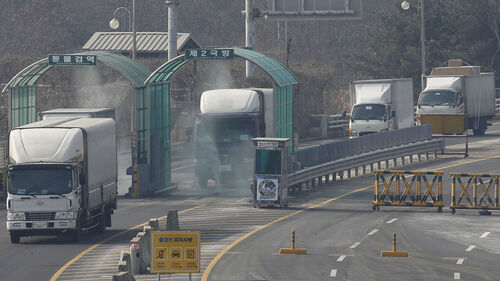 ▲ 2016년 2월 파주시 경의선 남북출입사무소에서 개성공단 차량이 입경하는 모습