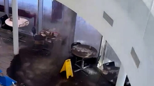 건물 천장에서 시꺼먼 물이 콸콸콸 마치 폭포처럼 쏟아집니다.