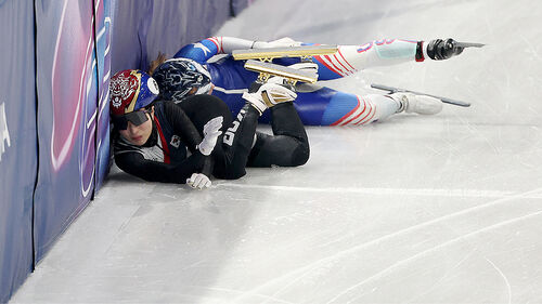 ▲ 10일(현지시간) 이탈리아 밀라노 아이스스케이팅 아레나에서 열린 2026 밀라노ㆍ코르티나담페초 동계올림픽 쇼트트랙 혼성계주 준결승에서 한국 김길리가 넘어지며 펜스와 충돌하고 있다.