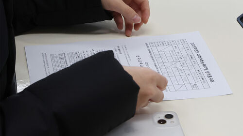 ▲ 2026학년도 대학수학능력시험 성적표가 배부된 지난해 12월 5일 오전 부산 금정구 동래여자고등학교 3학년 교실에서 학생들이 자신의 수능 성적을 확인하고 있다.