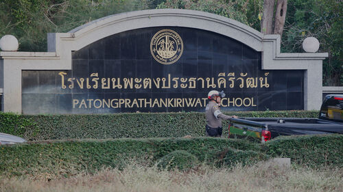 ▲ 태국 남부 송클라주 핫야이 지역의 한 고등학교에서 현지시간 11일 총격사건이 발생한 고등학교 앞에 태국 경찰이 서 있다.