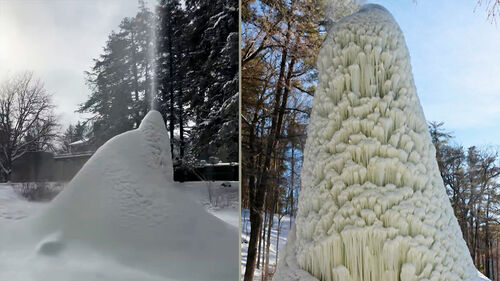 높은 곳에 있는 물이 아래로 흘러내리면서 관 내부 압력이 높아지고 이 압력으로 다시 물이 위로 뿜어져 올라가는데, 이렇게 분출된 물은 바닥에 떨어진 순간부터 얼기 시작해 겹겹이 쌓이며 거대한 원뿔 모양 구조물을 형성한다고 하네요.