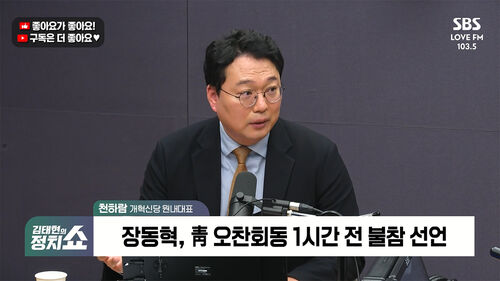 ▶천하람 : 네, 국민의힘도 없어요. 거기 그냥 언론에서 자꾸 욕먹고 하니까 그냥 하는 척만 하는 거지 별로 국민의힘 자체도. 지금 윤어게인 세력을 그렇게 두려워하는데 저희 개혁신당하고 엮이는 거 별로 안 좋아합니다, 실제로. 그쪽에서도 그렇게 좋아하지 않고요.
