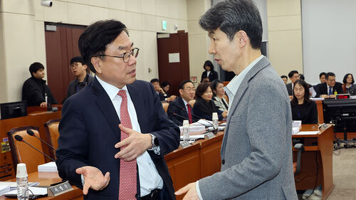▲ 12일 더불어민주당 윤건영 간사(오른쪽)와 국민의힘 서범수 간사가 충남대전, 전남·광주, 대구경북 지역의 행정통합을 위한 특별법과 관련, 얘기를 나누고 있다.