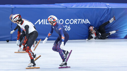 ▲ 14일(현지시간) 이탈리아 밀라노 아이스스케이팅 아레나에서 열린 2026 밀라노·코르티나담페초 동계올림픽 쇼트트랙 남자1,500m 준준결승에 출전한 임종언이 넘어져있다.