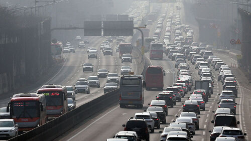 ▲ 설 연휴 둘째 날인 15일 경부고속도로 서울 잠원IC 인근이 서울을 빠져나가는 하행선 차량(오른편)으로 붐비고 있다.
