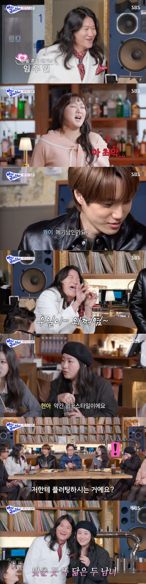 그리고 곧 남자 메기가 등장했다. 임우일의 등장에 카이는 "메기 남인가요?"라고 했고, 탁재훈은 "진짜 메기가 온 건가요?"라고 물어 웃음을 자아냈다. 또한 뚜지는 먹던 것까지 뱉어내며 폭풍적인 반응을 보여 눈길을 끌었다.