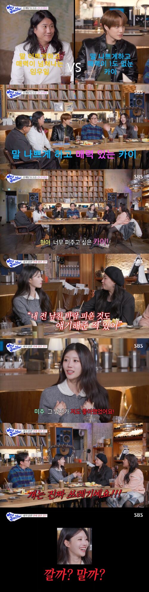 이날 이미주는 자신의 이상형이 말을 예쁘게 하는 사람이라며 외모는 보지 않는다고 했다. 이에 이상민은 "말 예쁘게 하고 매력 많은 임우일과 말 나쁘게 하고 매력이 1도 없는 카이 둘 중 누가 더 좋으냐?"라고 물었다.