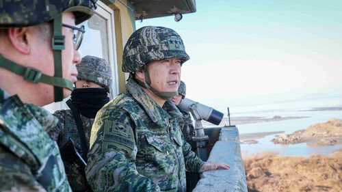 ▲ 주일석 해병대사령관이 17일 서해 북방한계선(NLL) 최전방 우도경비대 합동대공감시소(JAOP)에서 우도경비대장과 함께 전방지역을 확인하며 작전대비태세를 점검하고 있다.