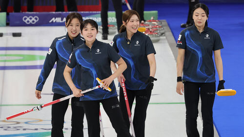 ▲ 17일(현지시간) 이탈리아 코르티나담페초 컬링 올림픽 스타디움에서 열린 2026 밀라노·코르티나담페초 동계올림픽 컬링 여자 라운드로빈 스위스와의 경기에서 5:7로 패한 한국 대표팀 선수들이 경기가 끝난 뒤 밝은 표정으로 돌아서고 있다.