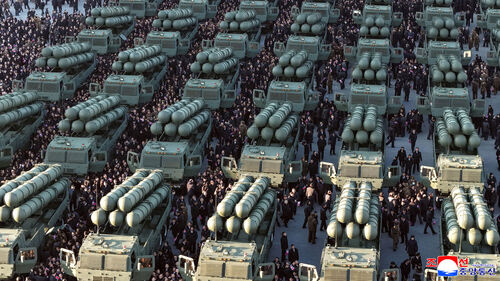 중앙통신은 김정은이 방사포 차량을 직접 운전했고, 광장에서 이 무기체계를 사열했다고 전했습니다.