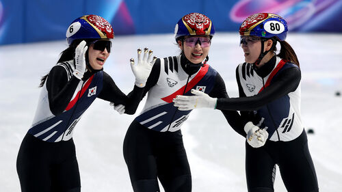 ▲ 18일(현지시간) 2026 밀라노-코르티나담페초 동계올림픽 쇼트트랙 여자 3000m 계주 결승A에서 금메달을 획득한 김길리, 최민정, 노도희가 축하하고 있다.