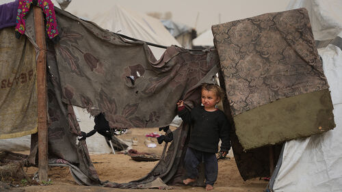 ▲ 팔레스타인 어린이가 가자지구 임시 난민 캠프에 서 있는 모습
