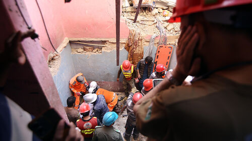 ▲ 현지 시간 19일 파키스탄 남부 카라치의 한 아파트가 가스 폭발로 무너진 현장에서 구조대원들이 구조 작업을 벌이고 있다.