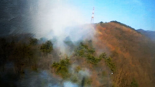 산등성이에서 희뿌연 연기가 피어오릅니다.