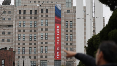 ▲ 22일 서울 중구 주한 러시아대사관 건물 외벽에 '승리는 우리의 것이다'라고 적힌 현수막이 걸려있다.