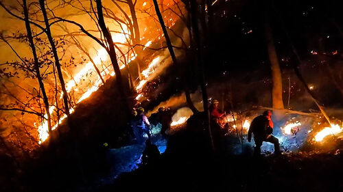 캄캄한 밤, 산이 시뻘건 불길과 희뿌연 연기로 뒤덮였습니다.