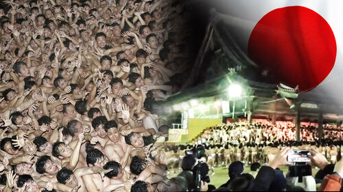 일본 전통 속옷만 입은 수많은 남성들이 위로 팔을 뻗은 채 한 데 뒤엉켜 있습니다.