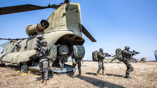 ▲ 공중기동훈련에 참가한 17사단 장병들이 미2사단/한미연합사단 소속 치누크(CH-47)에 탑승하고 있는 모습.