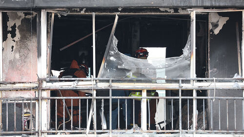 ▲ 24일 화재가 난 은마아파트의 해당 세대에서 경찰과 소방의 1차 현장 합동 감식이 진행되고 있다.