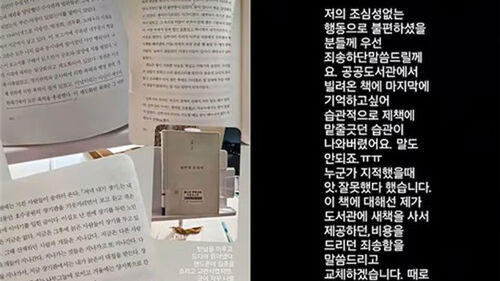 이어 "이 책에 대해선 제가 도서관에 새 책을 사서 제공하거나, 비용을 드려 죄송함을 말씀드리고 (책을) 교체하겠다"며 "때로 이렇게 부주의하게 행동을 하게 된다. 따끔하게 알아듣고 앞으로는 행동을 조심하겠다"고 덧붙였습니다.