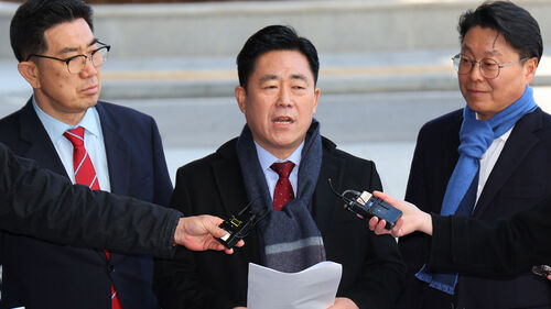▲ 김규환 전 미래통합당 의원이 통일교 관련 정교유착 의혹 수사를 받기 위해 25일 서울 서초구 서울고검으로 출석하면서 취재진 질의에 답하고 있다.