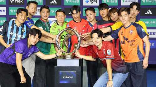 ▲ 25일 서울 서대문구 스위스 그랜드호텔 컨벤션센터에서 열린 '하나은행 K리그 2026 개막 미디어데이'에서 각 팀 선수들이 기념촬영을 하고 있다.