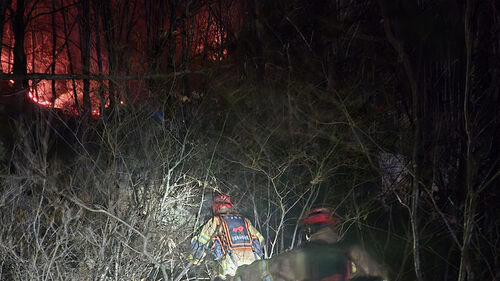 ▲ 25일 오후 경북 영주시 안정면 용산리 야산에 공군 전투기가 추락하면서 발생한 산불 현장에서 소방당국이 진화하고 있다.