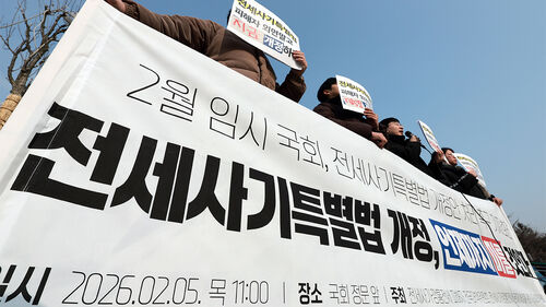 ▲ 5일 국회 정문 앞에서 전세사기·깡통전세 피해자 전국대책위원회가 연 기자회견에서 참석자들이 2월 임시 국회에서 전세사기특별법 개정안을 처리할 것을 촉구하고 있다.