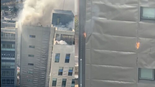 건물 외벽이 타고 있다는 신고를 접수한 소방 당국은 대응 1단계를 발령하고 진화 작업을 벌이고 있습니다.