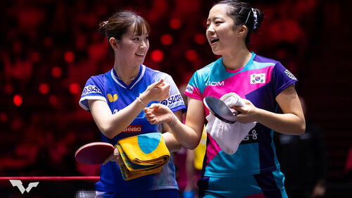 ▲ WTT 싱가포르 여자복식에 나선 신유빈(오른쪽)과 나가사키 미유