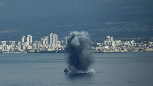▲ 28일(현지시간) 이스라엘의 이란 공격 후 전국적으로 경보가 발령된 가운데 이스라엘 북부 하이파 만에서 발사체가 수면 위에서 폭발하고 있다.