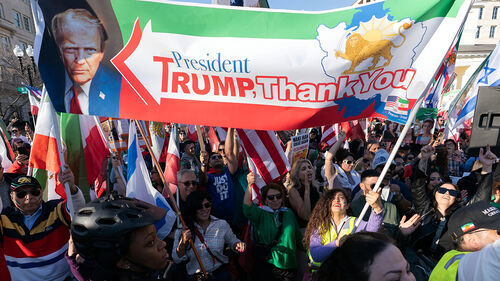 ▲ 28일 워싱턴에서 백악관 근처 집회에서 미국과 이스라엘의 이란 공격을 지지하는 사람들이 도널드 트럼프 대통령의 사진이 담긴 현수막을 들고 있다.