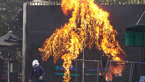 사방에서 총성이 울려 퍼지고, 시위대들이 피범벅이 된 동료를 부축하며 황급히 밖으로 빠져나옵니다.