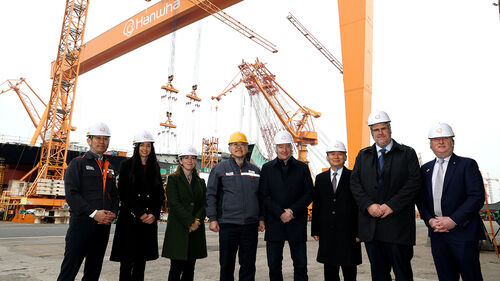 ▲ 스티븐 퓨어 캐나다 국방조달 특임장관이 2일 한화오션 거제사업장을 방문, 관계자들과 기념 촬영하고 있다.