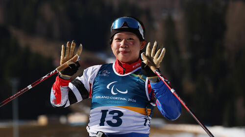 ▲ 7일(현지시간) 2026 밀라노·코르티나 동계 패럴림픽 파라바이애슬론 여자 스프린트 좌식 7.5㎞ 결선에서 김윤지가 결승선을 통과한 뒤 인사하고 있다.