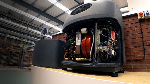 실외기의 냉매가 흡수한 공기 중의 열을 압축기로 압축해 고온·고압의 상태로 만들어, 물을 데우거나 난방을 하는 데 사용하는 방식입니다.