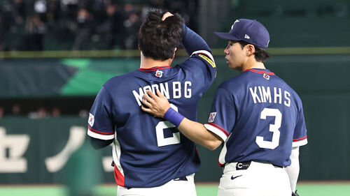 ▲ 7일 일본 도쿄돔에서 열린 2026 WBC 조별리그 C조 2차전 대한민국과 일본의 경기. 7회말 무사 일본 마키의 파울볼을 잡으려다 펜스에 부딪힌 한국 문보경이 김혜성과 대화하고 있다.